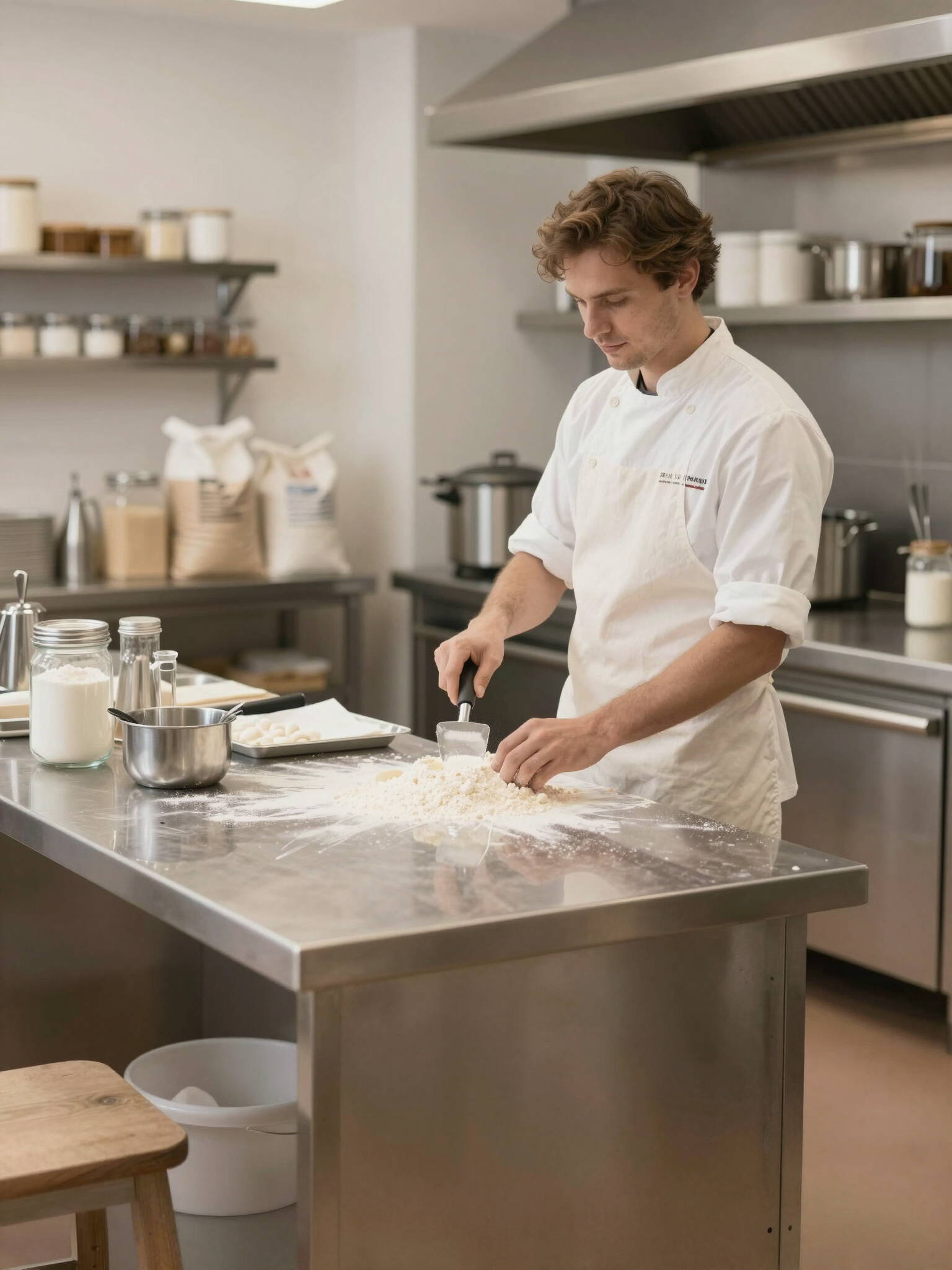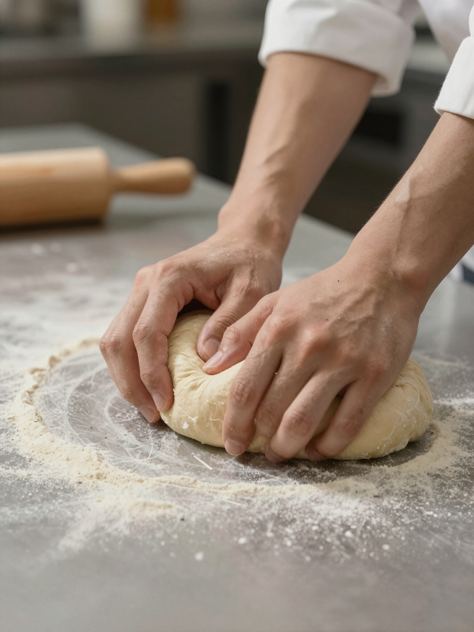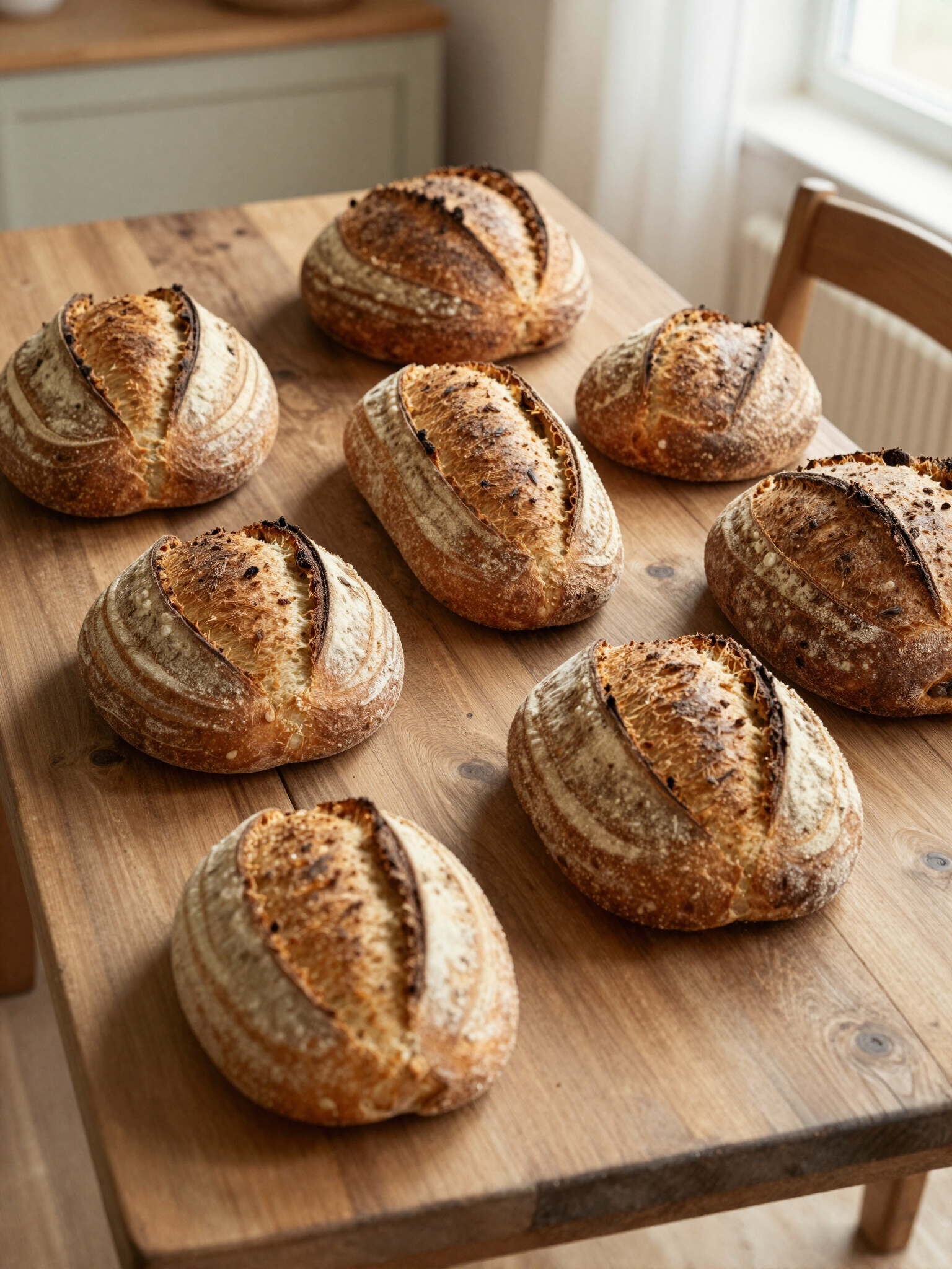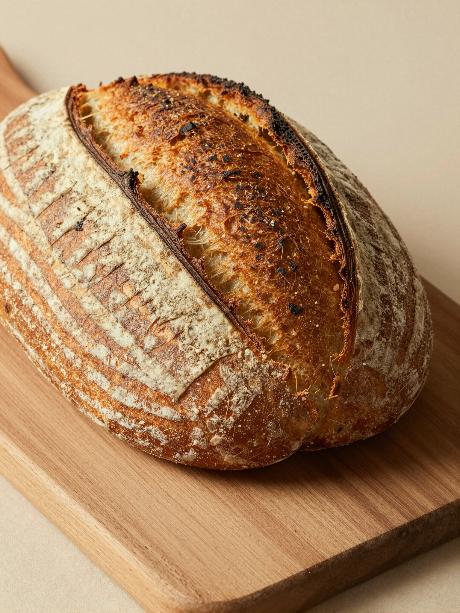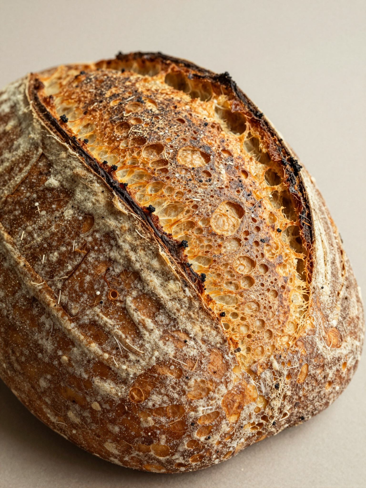 Nosso processo começa com uma receita ancestral: a fermentação lenta. Utilizamos levedura natural que desenvolve microorganismos únicos, garantindo uma textura leve e sabor complexo que não é possível com leveduras comerciais.